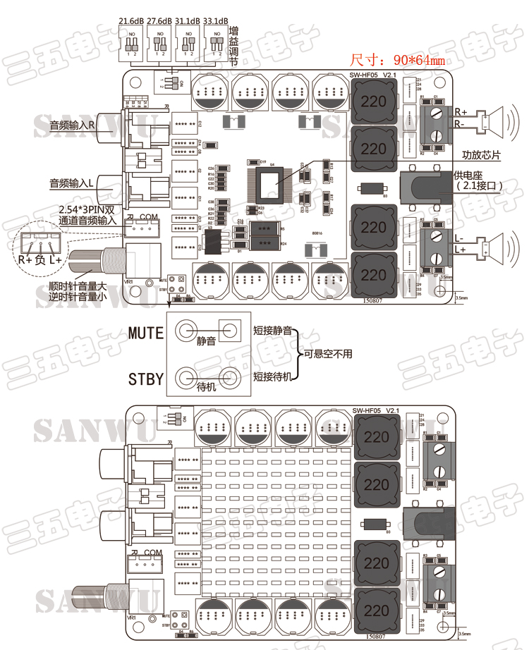 Power amplifier chip: TDA7498 (TDA7498 is 2X100W chip, TDA7498L is 2X80W chip)