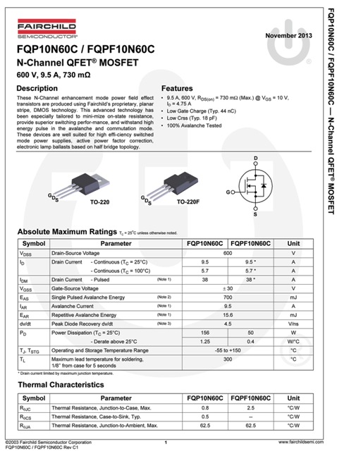 Link for Datasheet: https://www.fairchildsemi.com/datasheets/10N60C.pdf